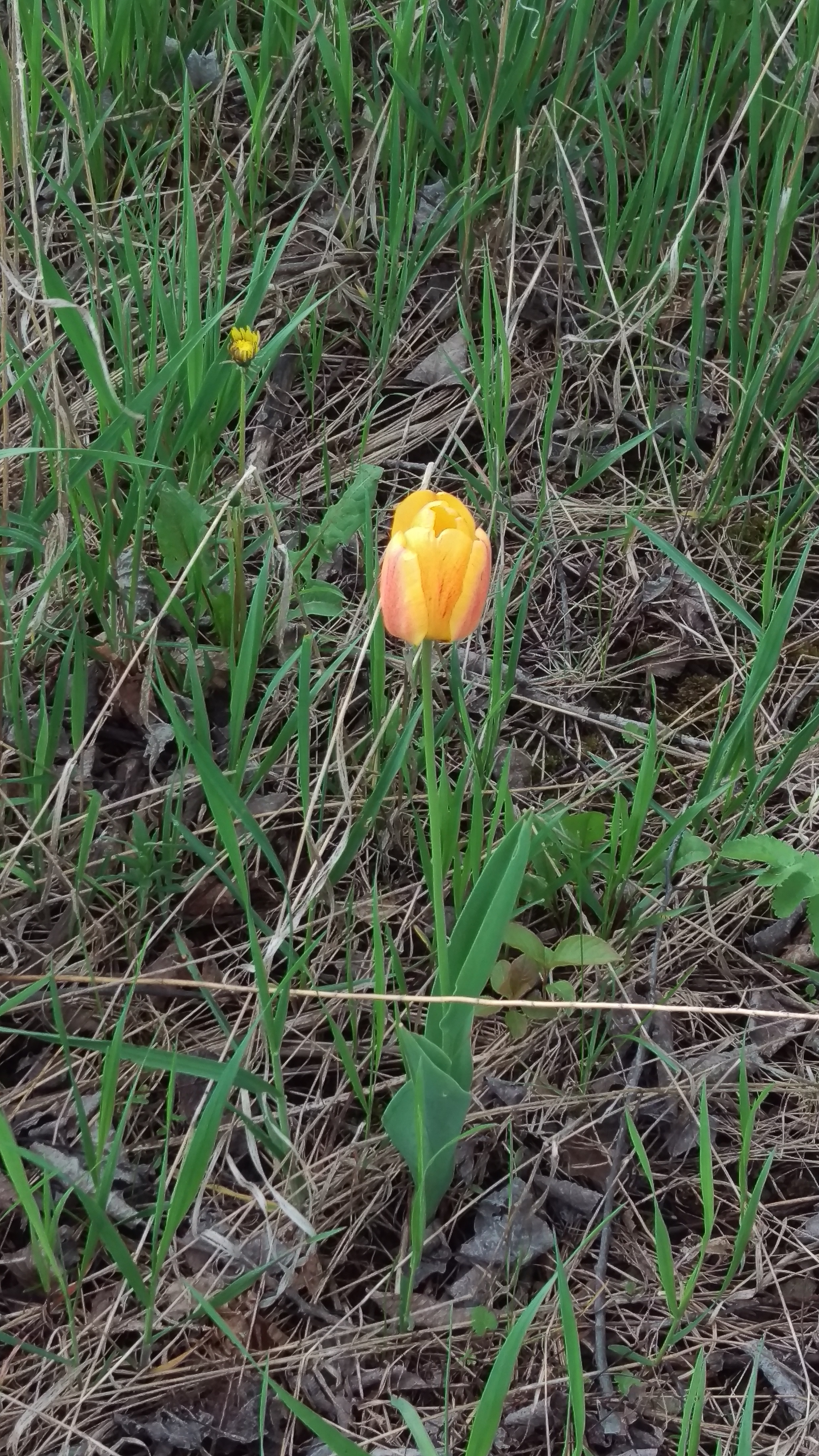 A single beautiful wild tulip growing along the fenceline