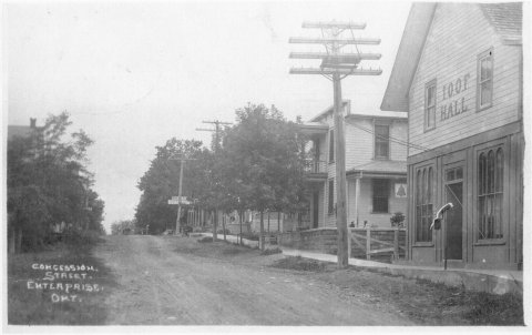 “The village of Enterprise has fully justified the expectations of its godfather by growing into a neat well kept business centre, not boasting of any extensive manufacturing, but well equipped with a number of stores of every description calculated to provide for all the wants of the thrifty farming community in the centre of which it is located. Fifty-seven years ago it was known as Thompson’s Corners, so named after Robert Thompson, the first merchant to open up a general store at this place. This store was located on the north-west corner of Concession and Main Streets opposite the store now occupied by Dr. Carscallen. One Adam Scott, a cobbler, had a bench in the same building, and mended the soles and patched the boots of such of the inhabitants who were not able to perform this service for themselves. Thompson sold out to one Joseph Campbell, who for some time continued to carry on business at the corner.